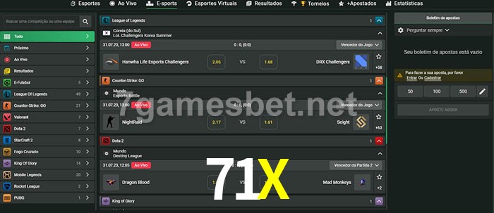 O 71X oferece uma grande seleção de opções de apostas em e-sports com probabilidades competitivas